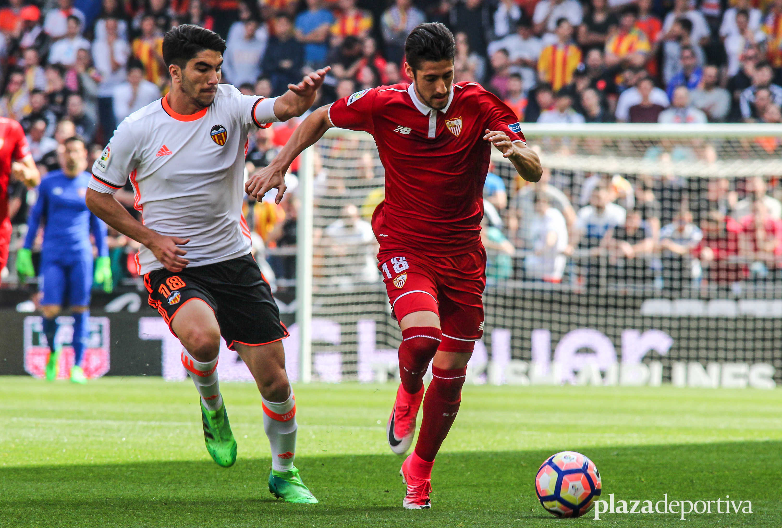 La réplica del Valencia llegó por parte de Simone Zaza. El italiano se nutrió de una buena conducción de Enzo Pérez en un contragolpe pero tras ganar la carrera a Lenglet, Sergio Rico sacó su remate con la pierna al más puro estilo de balonmano. Más frustración se llevó el ‘12’ valencianista cuando González González le invalidó un gol por mano en el control previo a su remate. Antes, Diego Alves había cometido falta y mano fuera del área en una acción con N'Zonzi que González González tampoco apreció.