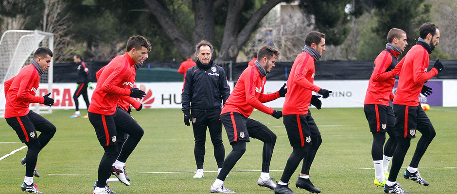 En el centro del campo, entrenó con Saúl, Gabi y Koke; mientras que en la delantera incluyó al francés Antoine Griezmann y el argentino Luciano Vietto en un primer partidillo con diez jugadores; para luego sumar al colombiano Jackson Martínez en punta para un once contra once, en el que Griezmann pasó a ocupar la banda derecha.