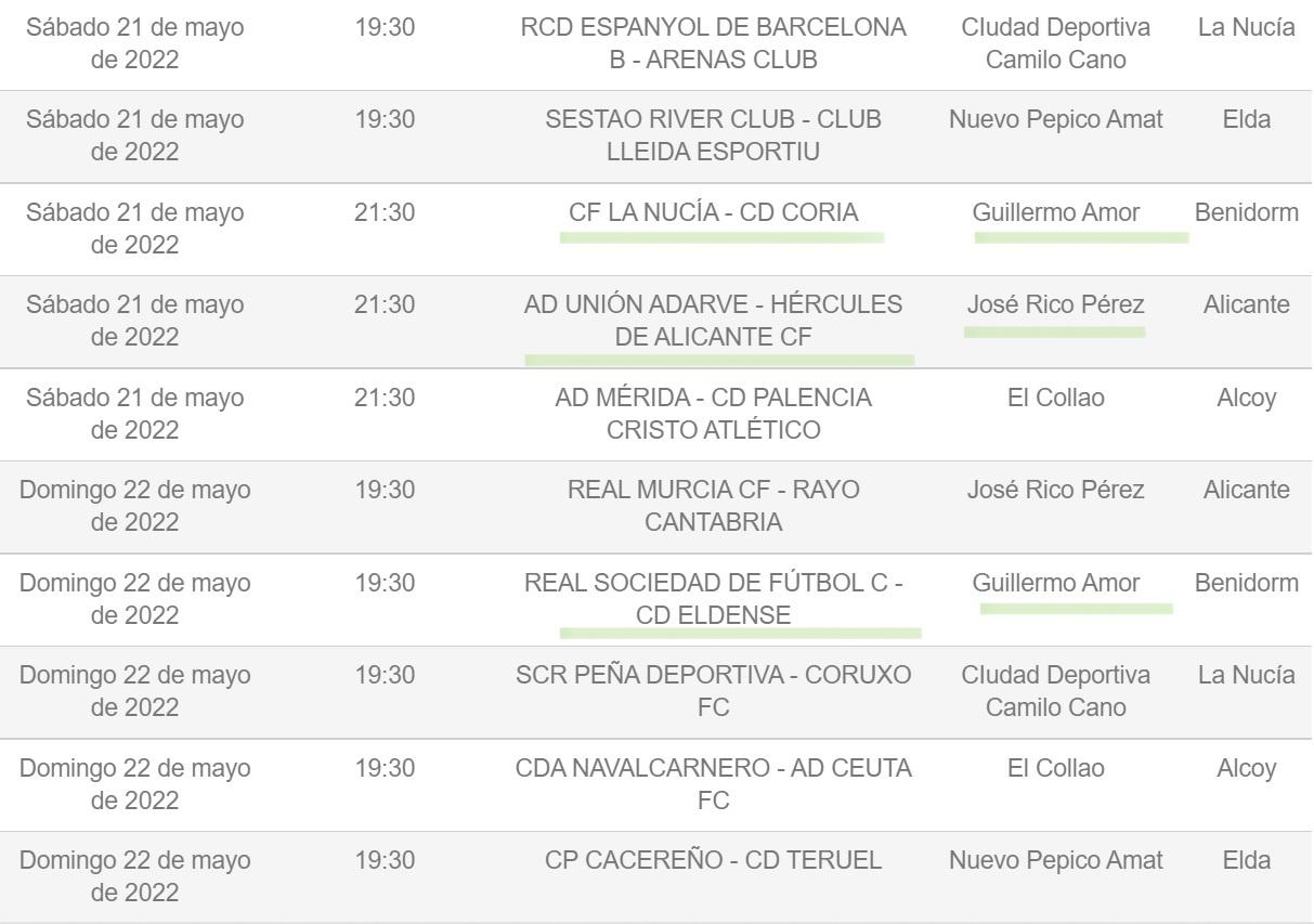 Mientras que el choque La Nucía-Coria se jugará el sábado desde las 21:30 horas, el Real Sociedad C-Eldense se disputará desde las 19:30 horas del domingo.
