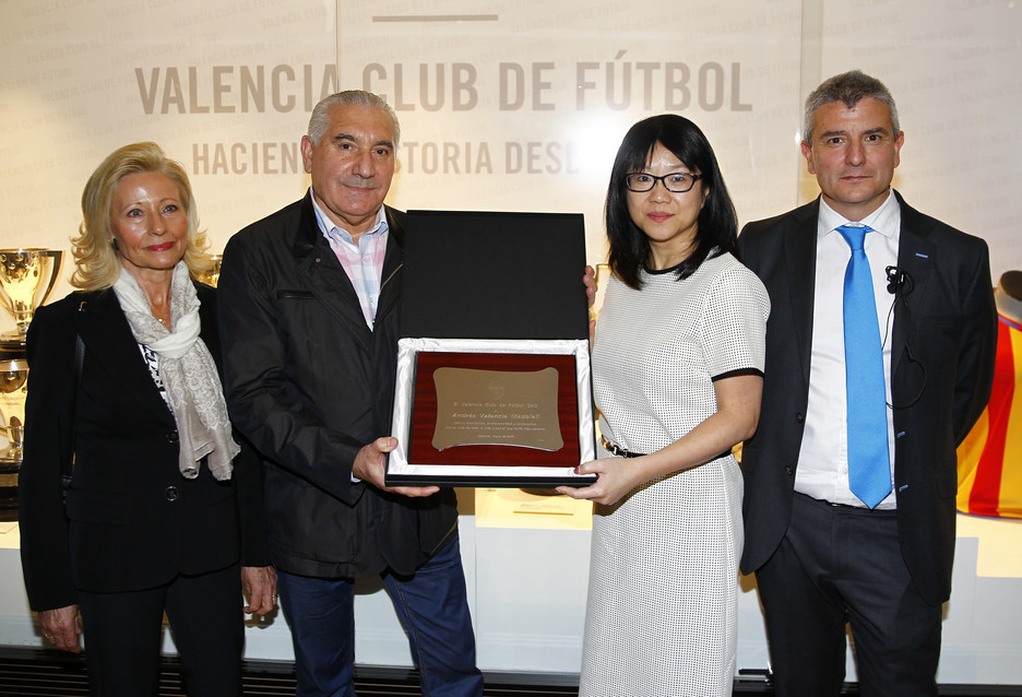 VALENCIA. En el descanso del choque entre el Valencia CF y la Real Sociedad, la presidenta, Layhoon Chan, le ha hecho entrega de una placa conmemorativa a Andrés Valencia a propósito de sus 44 años como empleado del Club. Valencia entró en el año 1971 y desempeñó diversas funciones en la entidad, como jefe de sector siempre vinculado a su segunda casa, el Camp de Mestalla, siempre en controles de acceso al estadio.