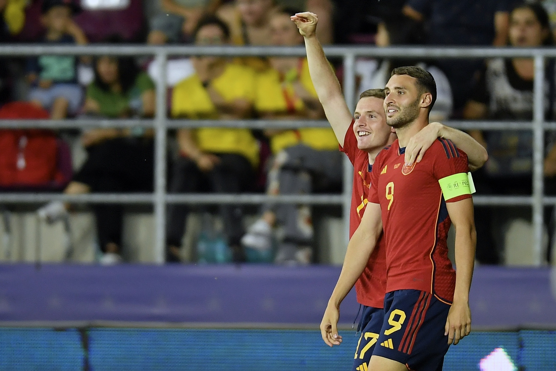 España: Arnau Tenas; Víctor Sánchez, Aitor Paredes, Jon Pacheco, Juan Miranda; Antonio Blanco, Aimar Oroz, Gabri Veiga; Rodri Sánchez, Sergio Gómez y Abel Ruiz.