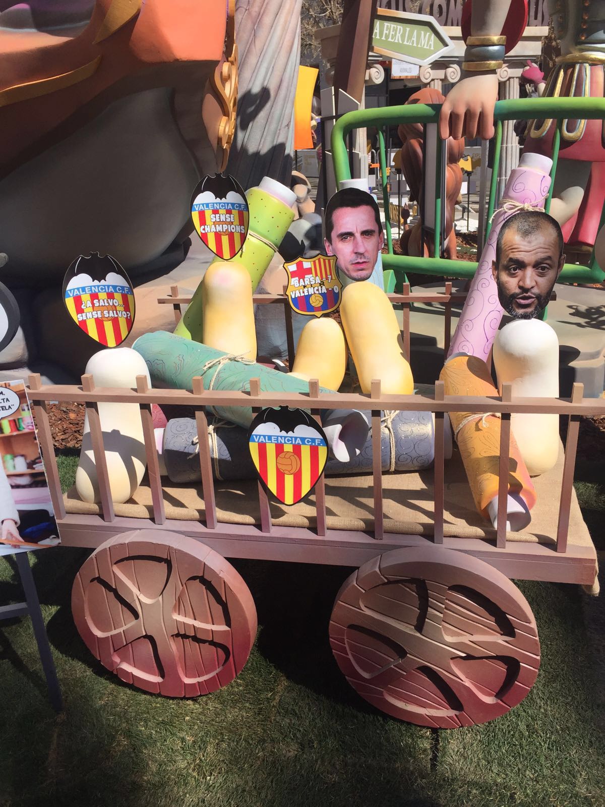VALENCIA. La falla Almirante Cadarso con Reino de Valencia tira de sátira en sus ninots contra la gestión de Peter Lim en el Valencia CF en la que rememora las tremenda derrota ante el Barça por 7-0 en la Copa del Rey, el fracaso de no jugar la fase final de la Champions así como la salida del presidente Amadeo Salvo el pasado verano.