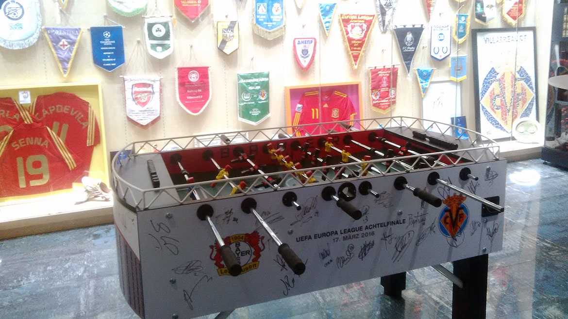 El Villarreal puso a subasta un futbolín que le regaló el equipo alemán del Bayer Leverkusen, como conmemoración del enfrentamiento de ambos equipos en los octavos de la Liga Europa de este año, y que ambas plantillas firmaron.