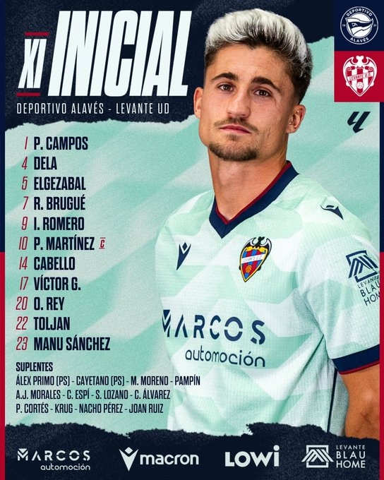 De este modo, el once del Levante UD estaría compuesto por: Pablo Cuñat; Toljan, Cabello, Dela, Elgezábal, Manu Sánchez; Oriol Rey, Pablo Martínez, Brugué, V. García e Iván Romero.