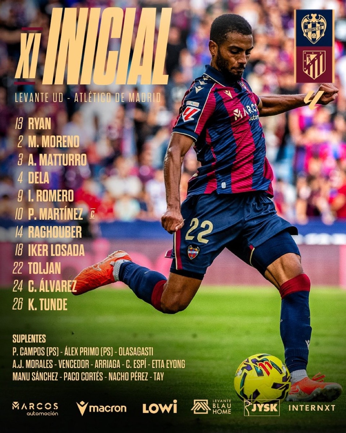 VALÈNCIA. El Levante UD ha hecho público el once escogido por Luís Castro para enfrentarse al Atlético de Madrid en el Ciutat de València.