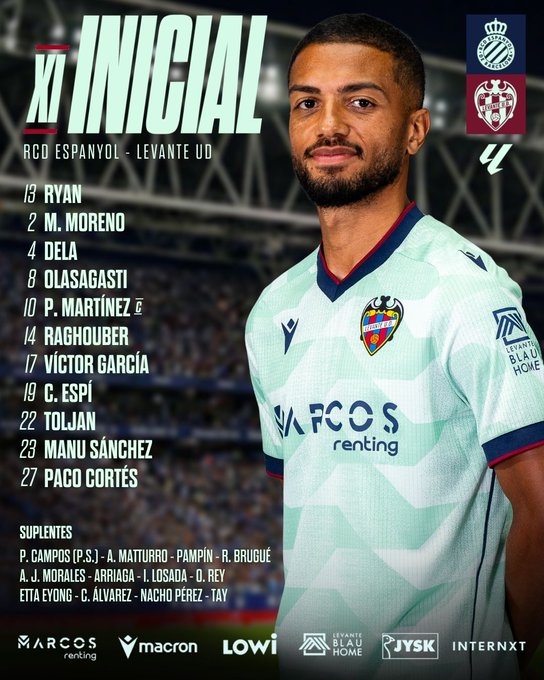 De este modo, el once del Levante UD estaría compuesto por: Ryan; Toljan, Dela, Moreno, Manu Sánchez; Raghouber, Pablo Martínez, Olasagasti, Paco Cortés, Víctor García y Carlos Espí.