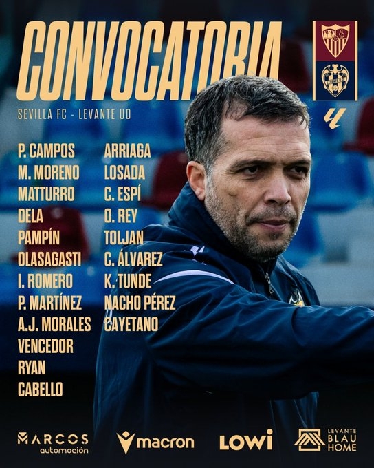 VALÈNCIA. Estos son los jugadores convocados para el encuentro correspondiente a la Jornada 18 de LALIGA EA SPORTS que disputará el Levante UD mañana domingo a las 14:00 horas ante el Sevilla FC en el Ramón Sánchez-Pizjuán.