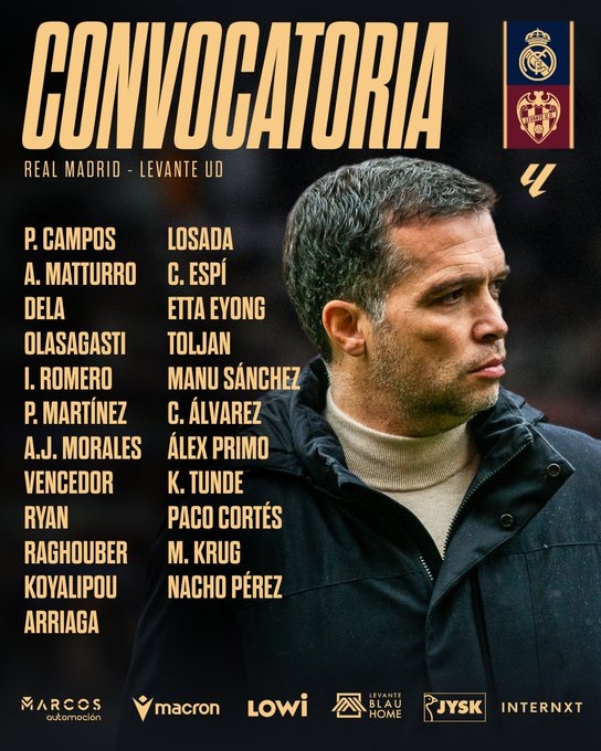 VALÈNCIA. Estos son los jugadores convocados para el encuentro correspondiente a la Jornada 20 de LALIGA EA SPORTS que disputará el Levante UD mañana sábado a las 14:00 horas ante el Real Madrid en el Estadio Santiago Bernabéu.