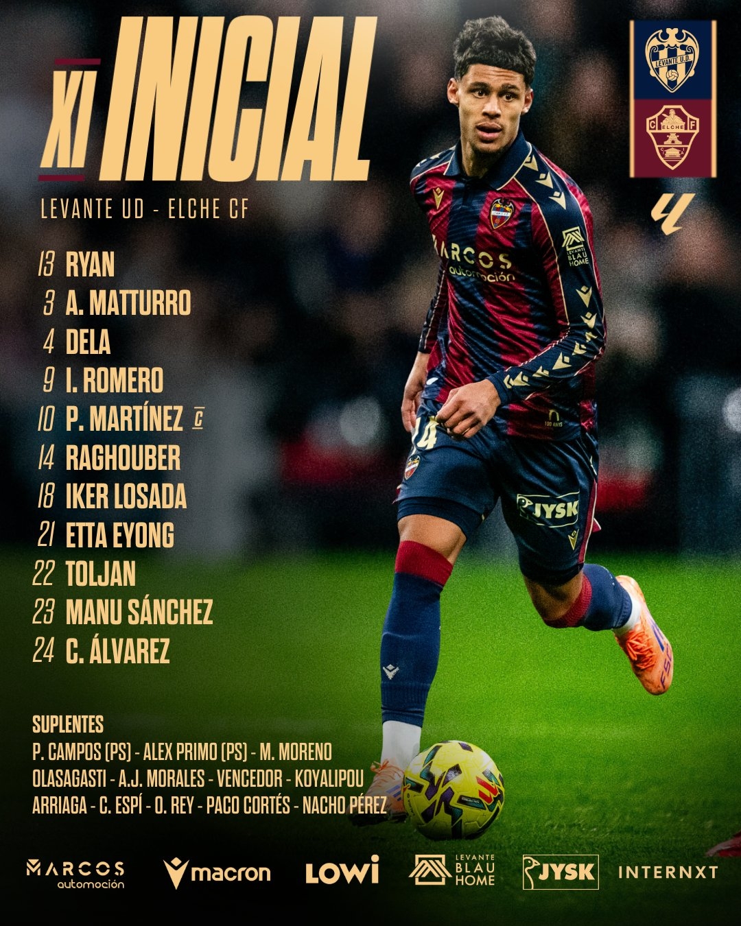 VALÈNCIA. El Levante UD ha hecho oficial el once elegido por Luís Castro para medirse al Elche CF en el Ciutat de València.