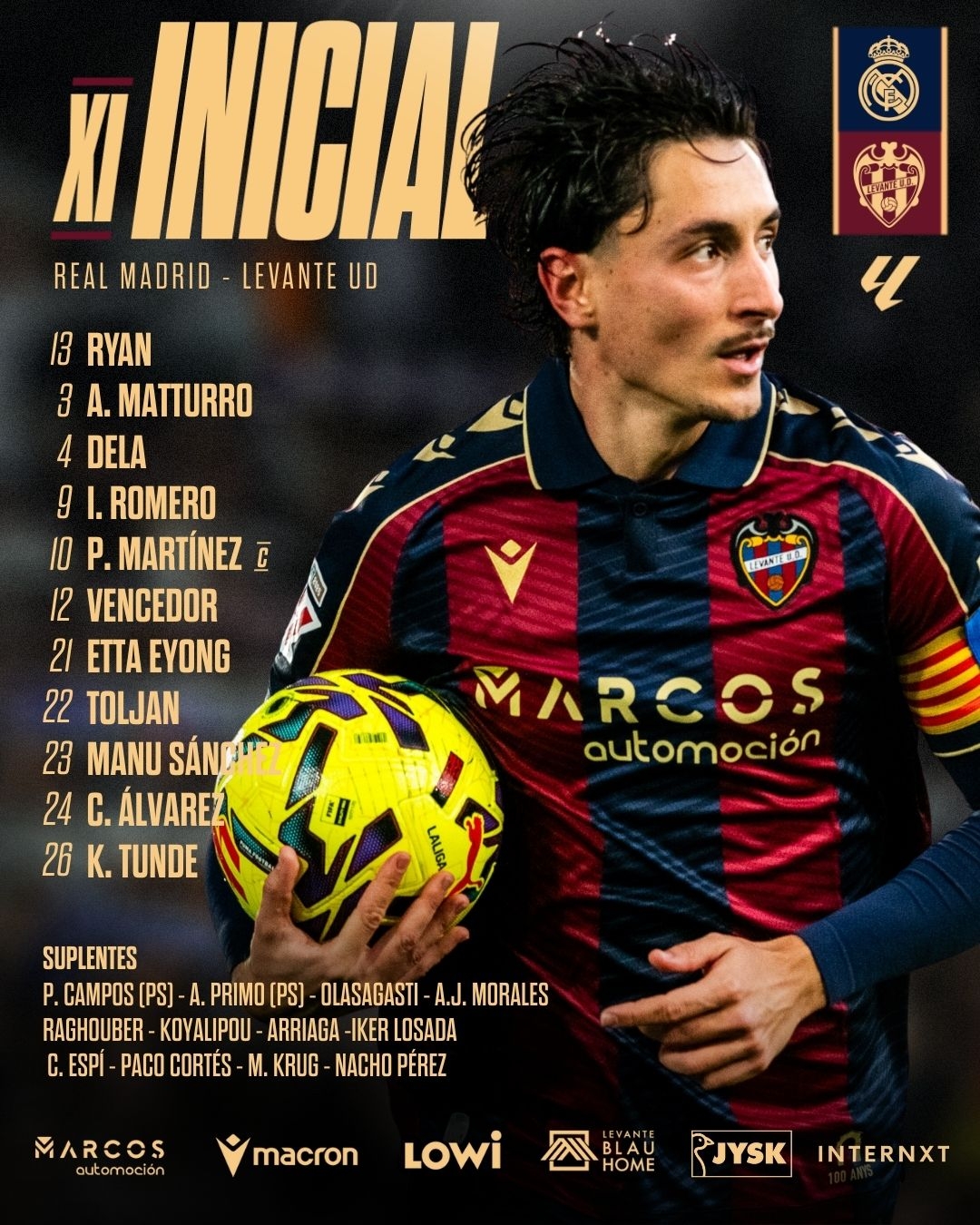 VALÈNCIA. El Levante UD ya ha hecho oficial el once oficial de Luís Castro para enfrentarse al Real Madrid. El choque correspondiente a la jornada 20 se disputa en unos minutos en el Bernabéu (14:00 horas).