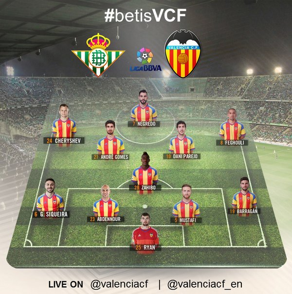 De este modo, el once está formado por Ryan; Barragán, Mustafi, Abdennour, Siqueira; Zahibo, Gomes, Parejo, Feghouli, Cheryshev y Negredo.