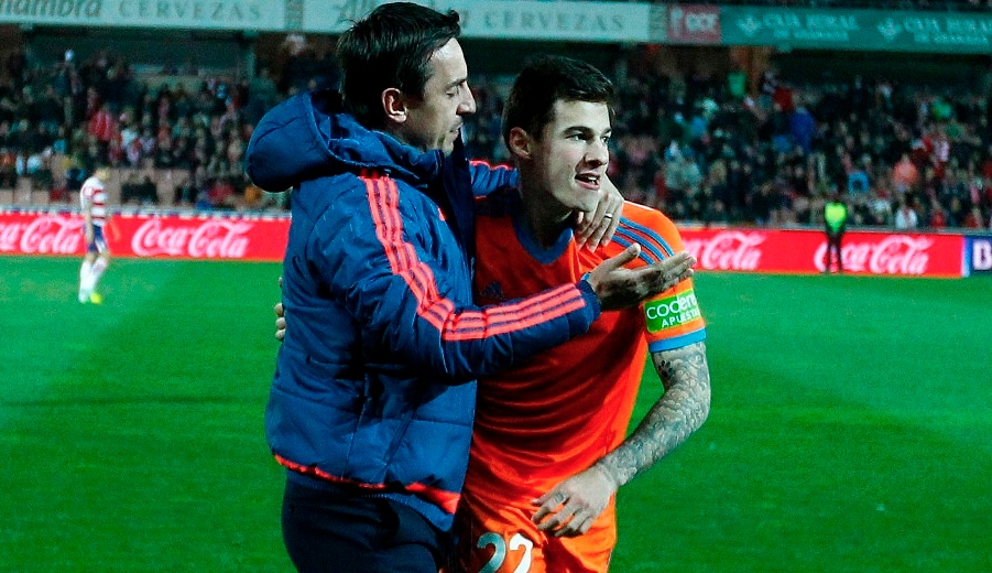 Gary Neville ensayó con un once en el que destaca la inclusión del '22' valencianista y es que si no hay ningún percance físico de última hora -André Gomes y Barragán están entre 'algodones-, estaría formado por Mathew Ryan en la portería y una línea defensiva formada por Barragán, Mustafi, Abdennour, Gayà.