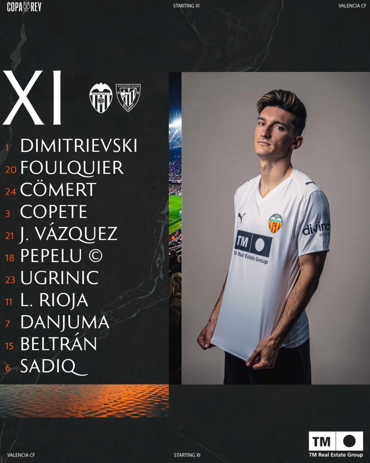 De este modo, el once del Valencia CF está compuesto por: Dimitrievski; Foulquier, Cömert, Copete, Jesús Vázquez; Pepelu, Ugrinic, Rioja, Danjuma; Beltrán y Sadiq.