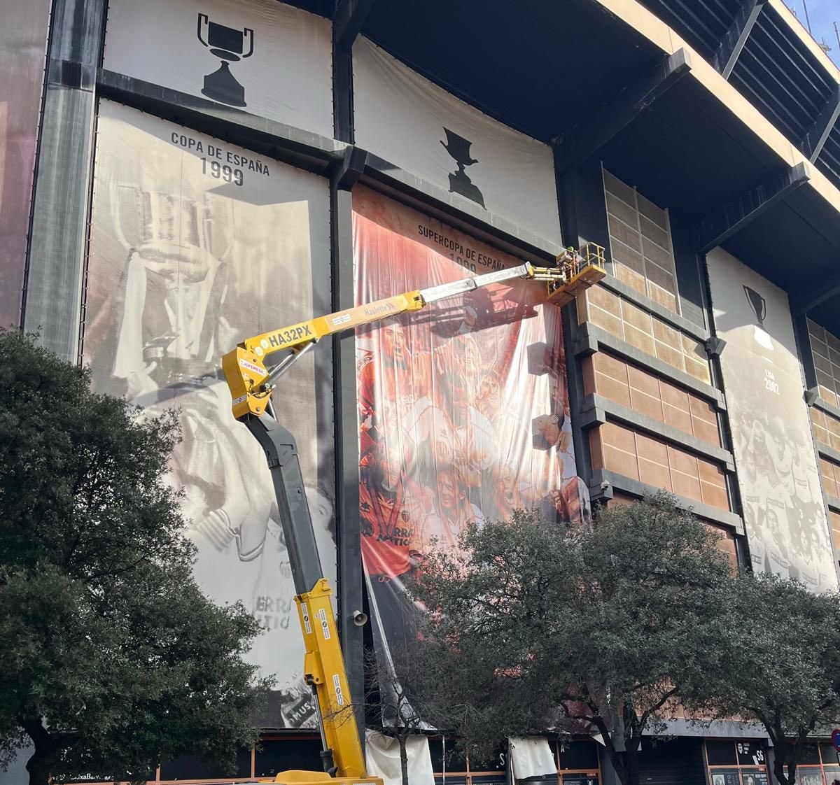 El Valencia repone la lona de Mestalla que destrozó el viento