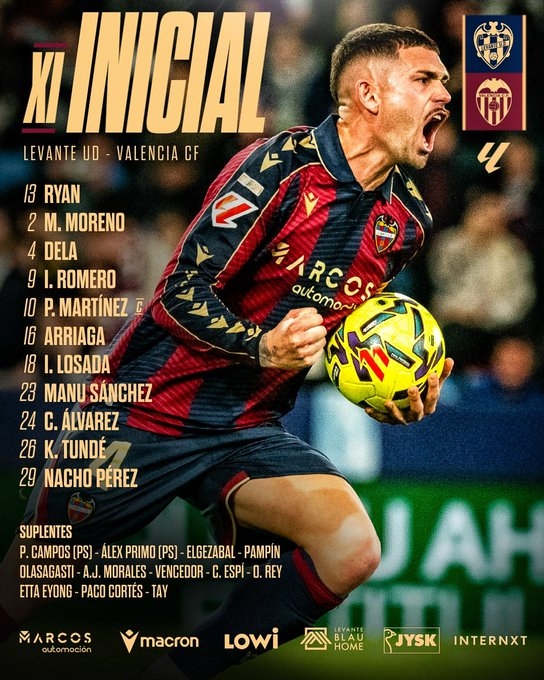 En el Levante UD, el once está formado por: Ryan; Nacho Pérez, Dela, Matías Moreno, Manu Sánchez; Arriaga, Pablo Martínez, Carlos Álvarez; Iván Romero, Tunde y Losada.